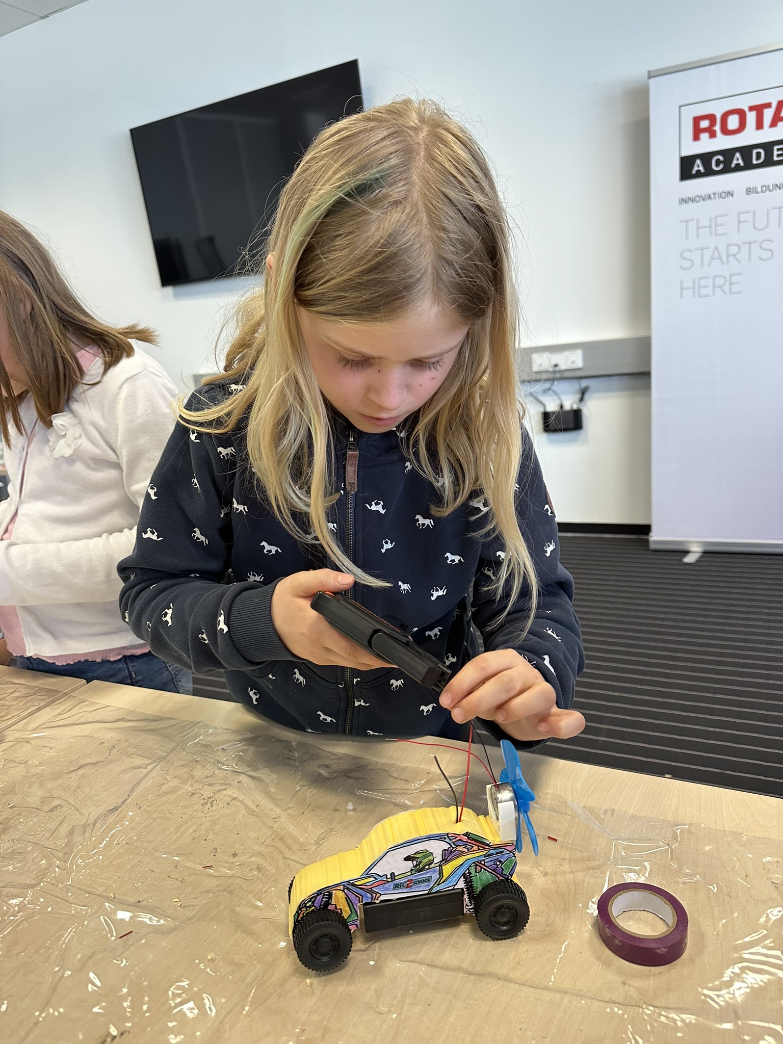 Dort nahmen sie an einem spannenden Workshop mit dem Titel „ELEKTRO-SSV – Coole Flitzer selbst gebaut“ teil. Mit viel Begeisterung und Geschick bauten die Schülerinnen ihre eigenen kleinen Elektro-Flitzer, die sie anschließend sogar mit nach Hause nehmen durften.